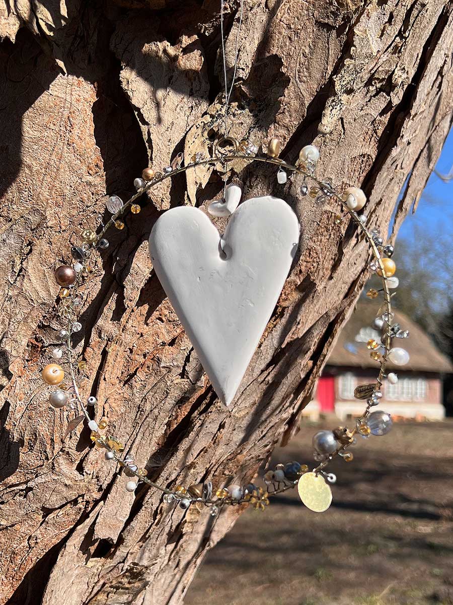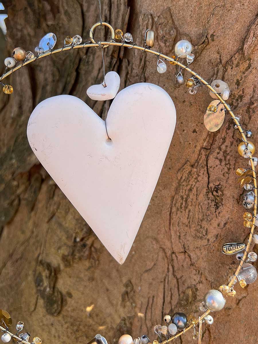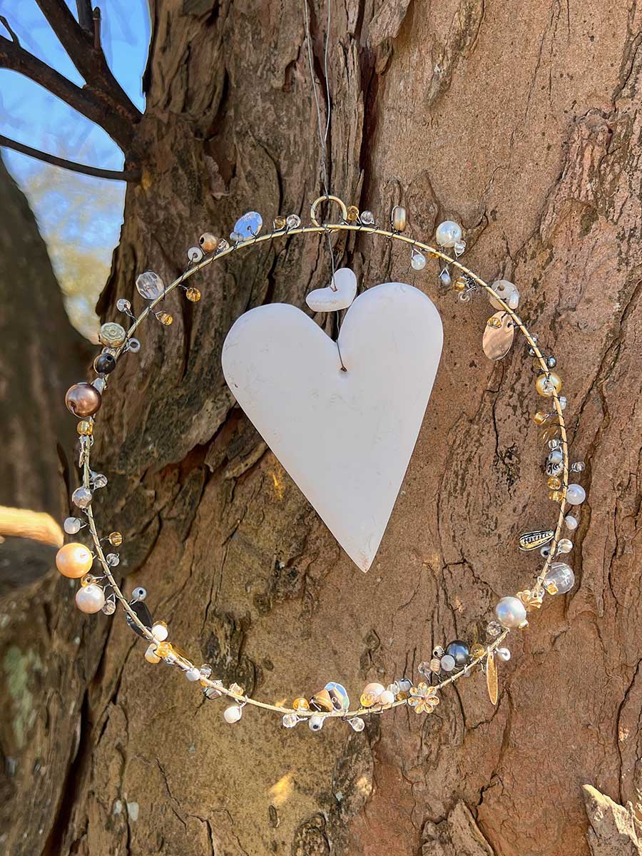 Dieser hübsche Perlenring von Bell'Arte mit Perlen / Pailletten in gold silber und Keramikherz in der Mitte bringt ein zauberhaftes Funkeln in die Wohnung. Ein eleganter Hingucker für Fenster, Türen und Wände. Mit Bändchen zum Aufhängen. Alle Perlenkränze werden in Handarbeit gefertigt, daher kann es zu kleinen Abweichungen in Form und Ausführung kommen.