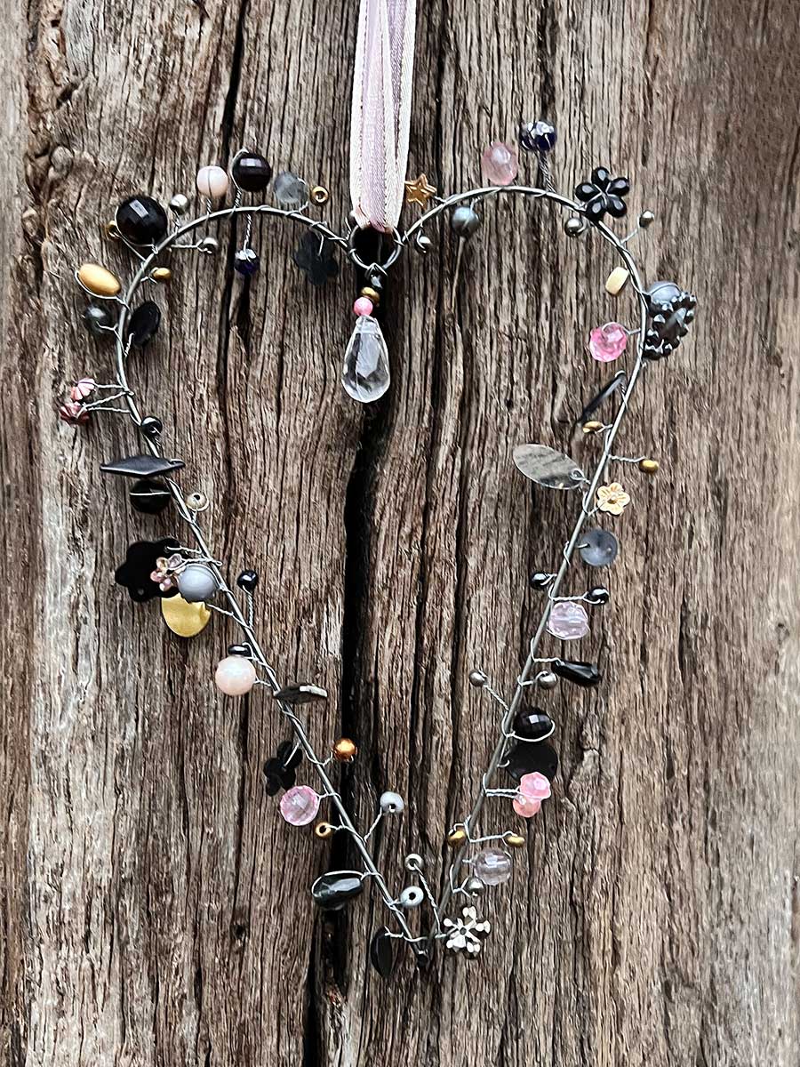 Dieses hübsche schmale Perlenherz von Bell'Arte mit Perlen, Pailletten in grau schwarz und Tropfenkristall in der Mitte bringt ein zauberhaftes Funkeln in die Wohnung. Ein eleganter Hingucker für Fenster, Türen und Wände. Mit Satinbändchen zum Aufhängen. Alle Perlenkränze werden in Handarbeit gefertigt, daher kann es zu kleinen Abweichungen in Form und Ausführung kommen.