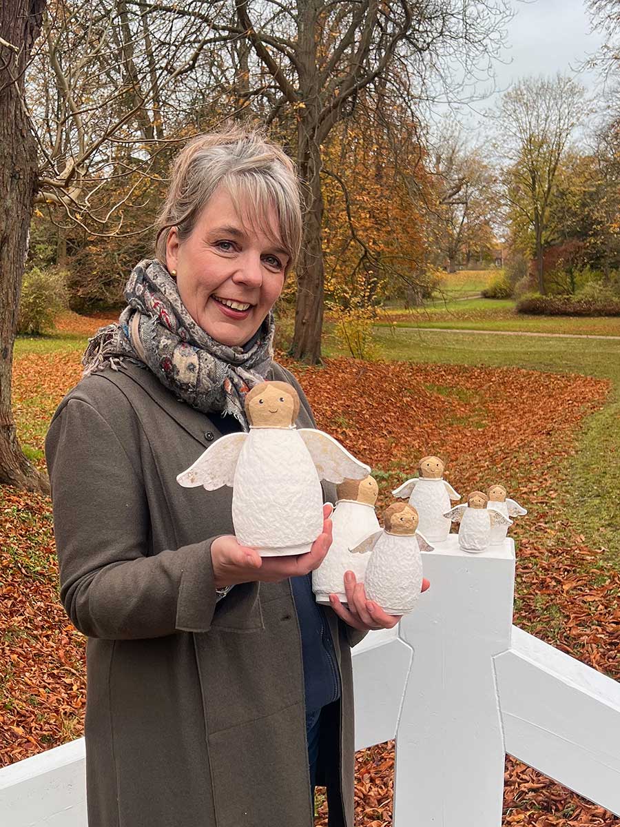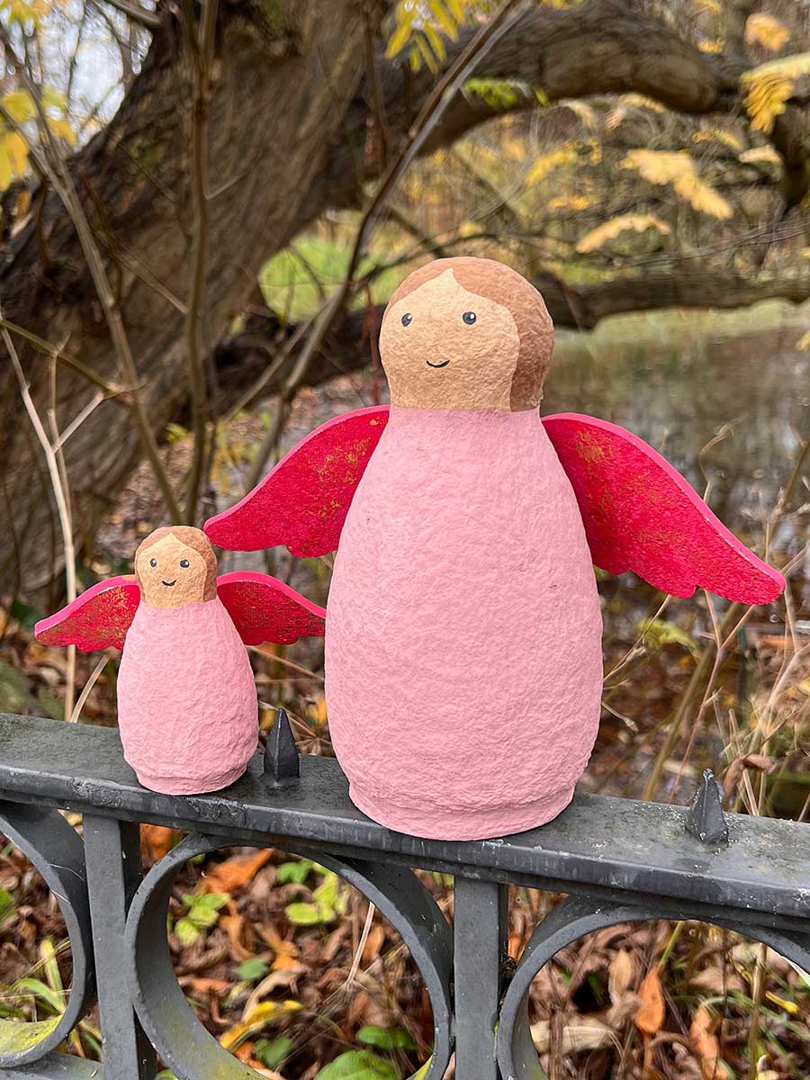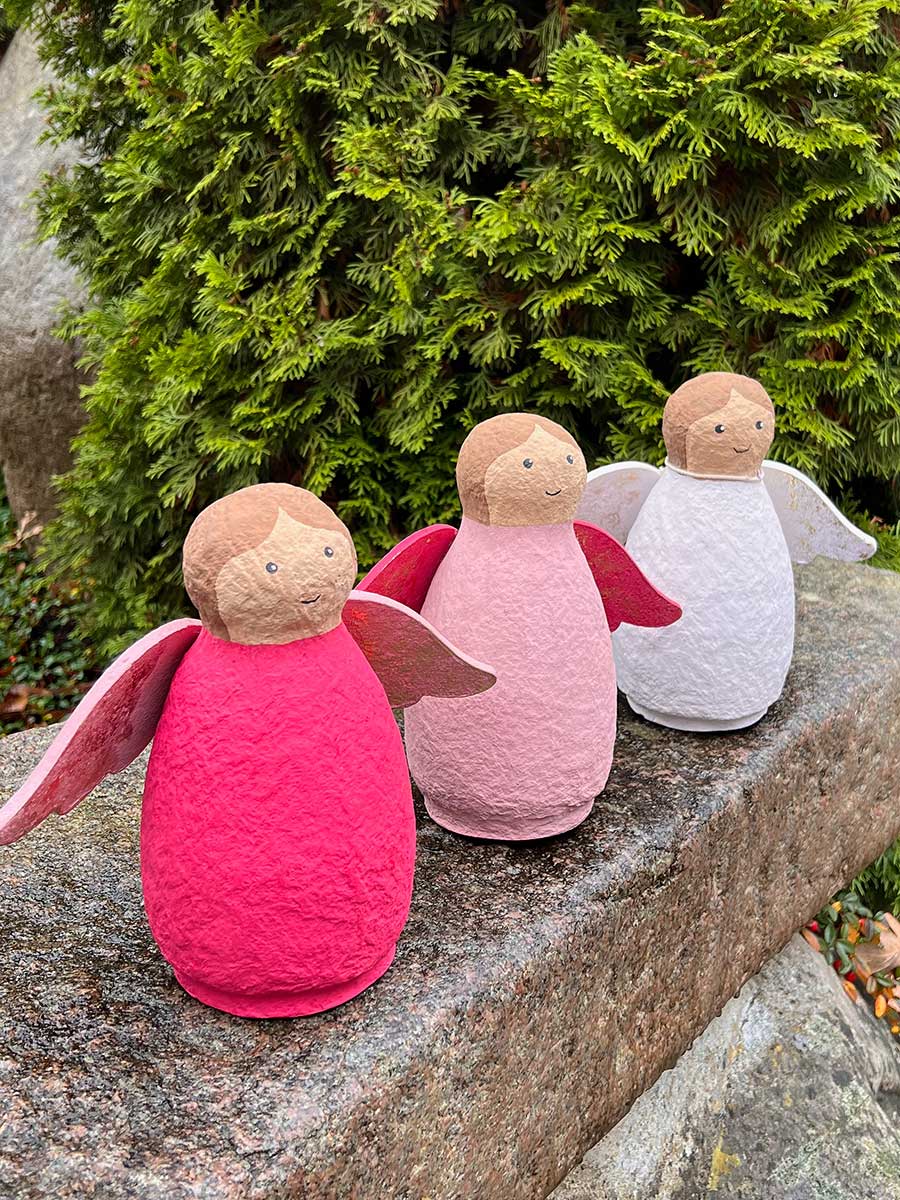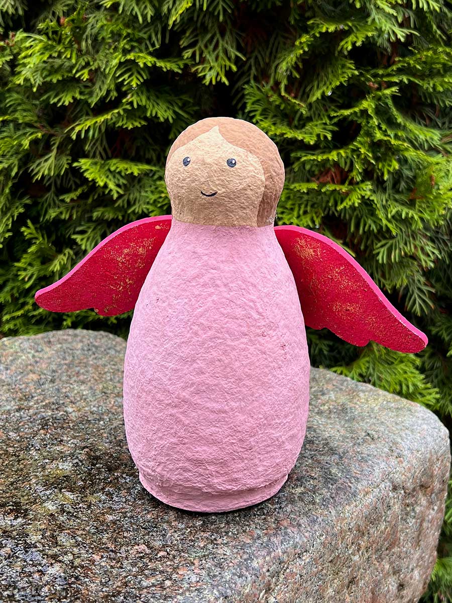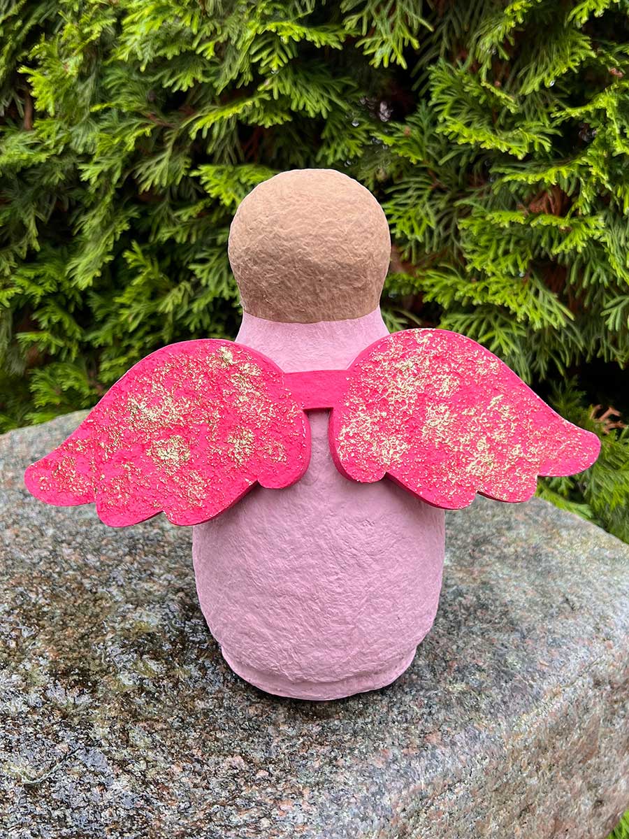 Zauberhafter rosafarbener Engel aus Pappmachee in Größe L mit pinken goldgesprenckelten Flügeln, tolles reduziertes Design