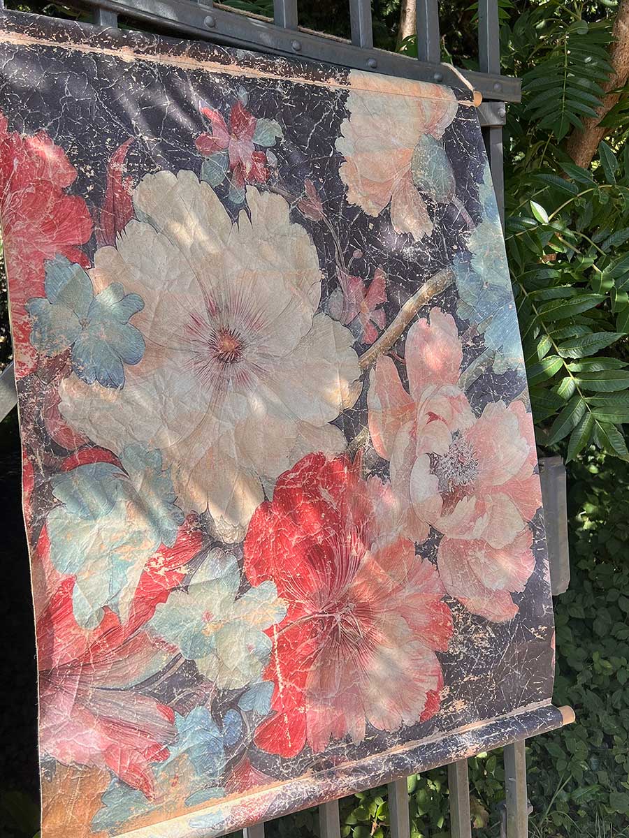 Außergewöhliches Wandbild im Antik-Look Motiv: Blüte. Der Wandbehang hat oben und unten Holzstangen eingeschoben und eine Kordel zum Aufhängen.