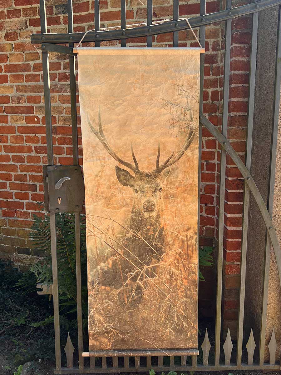 Außergewöhliches Wandbild im Antik-Look Motiv: Hirsch. Der Wandbehang hat oben und unten Holzstangen eingeschoben und eine Kordel zum Aufhängen.