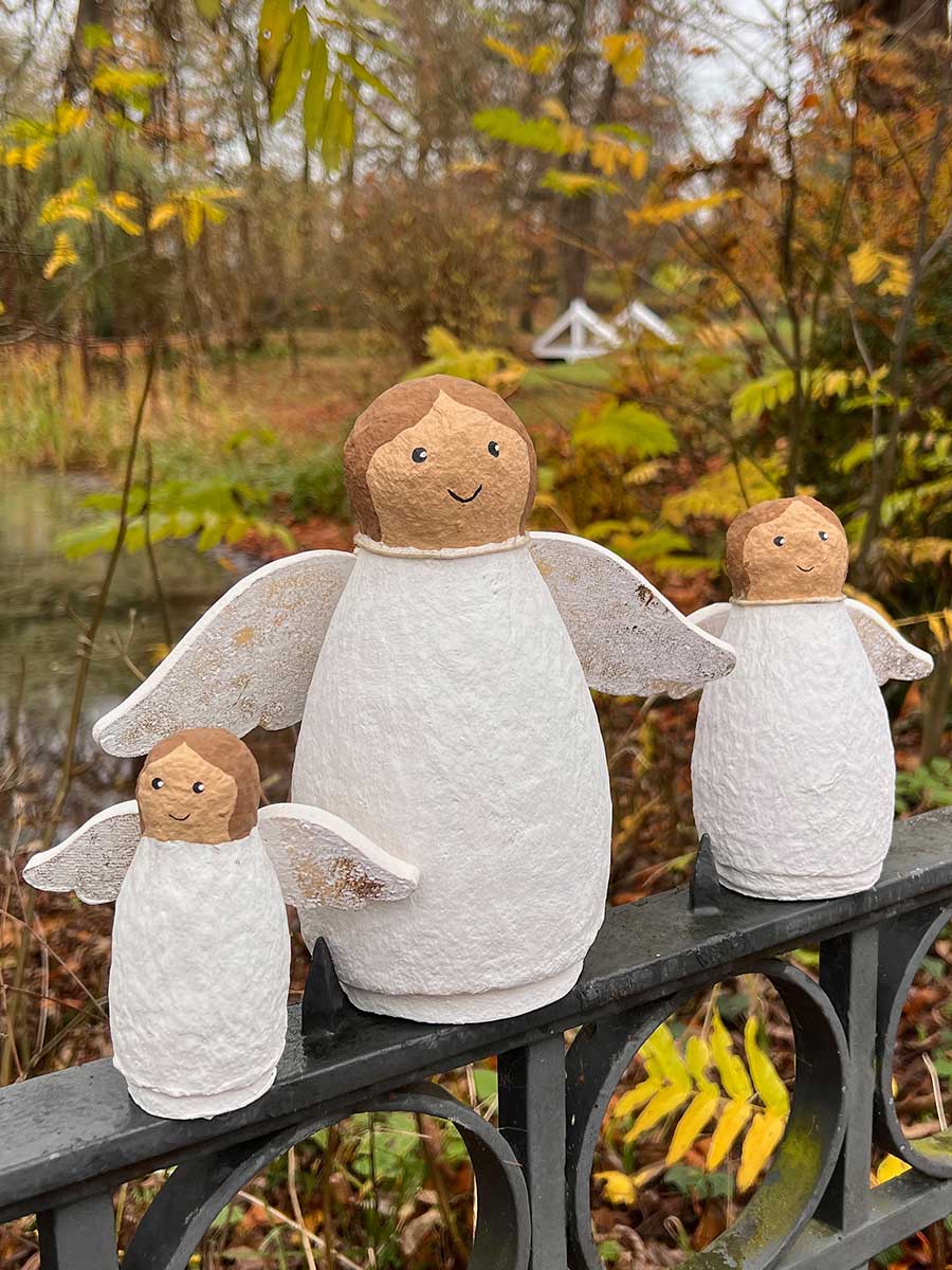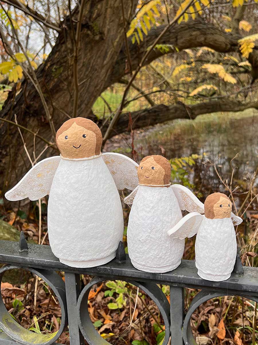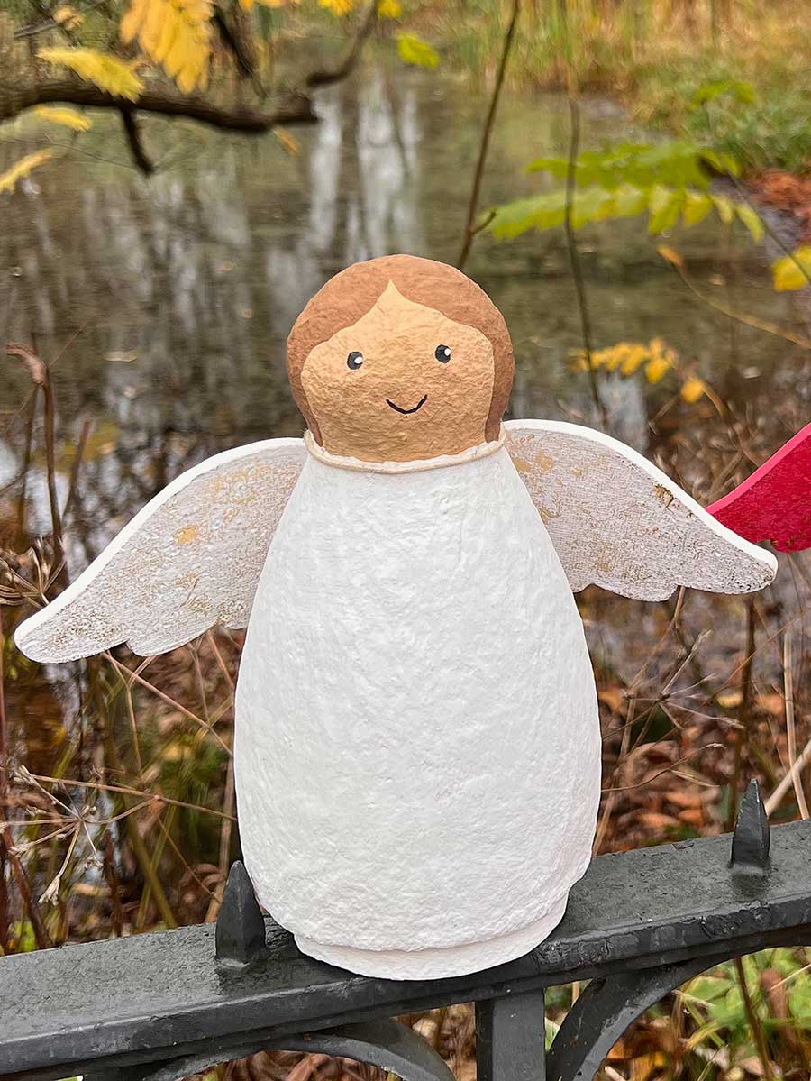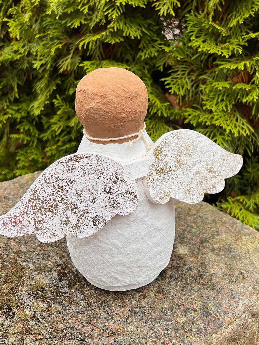 Zauberhafter weißer Engel aus Pappmachee in Größe L mit goldgesprenckelten Flügeln, tolles reduziertes Design