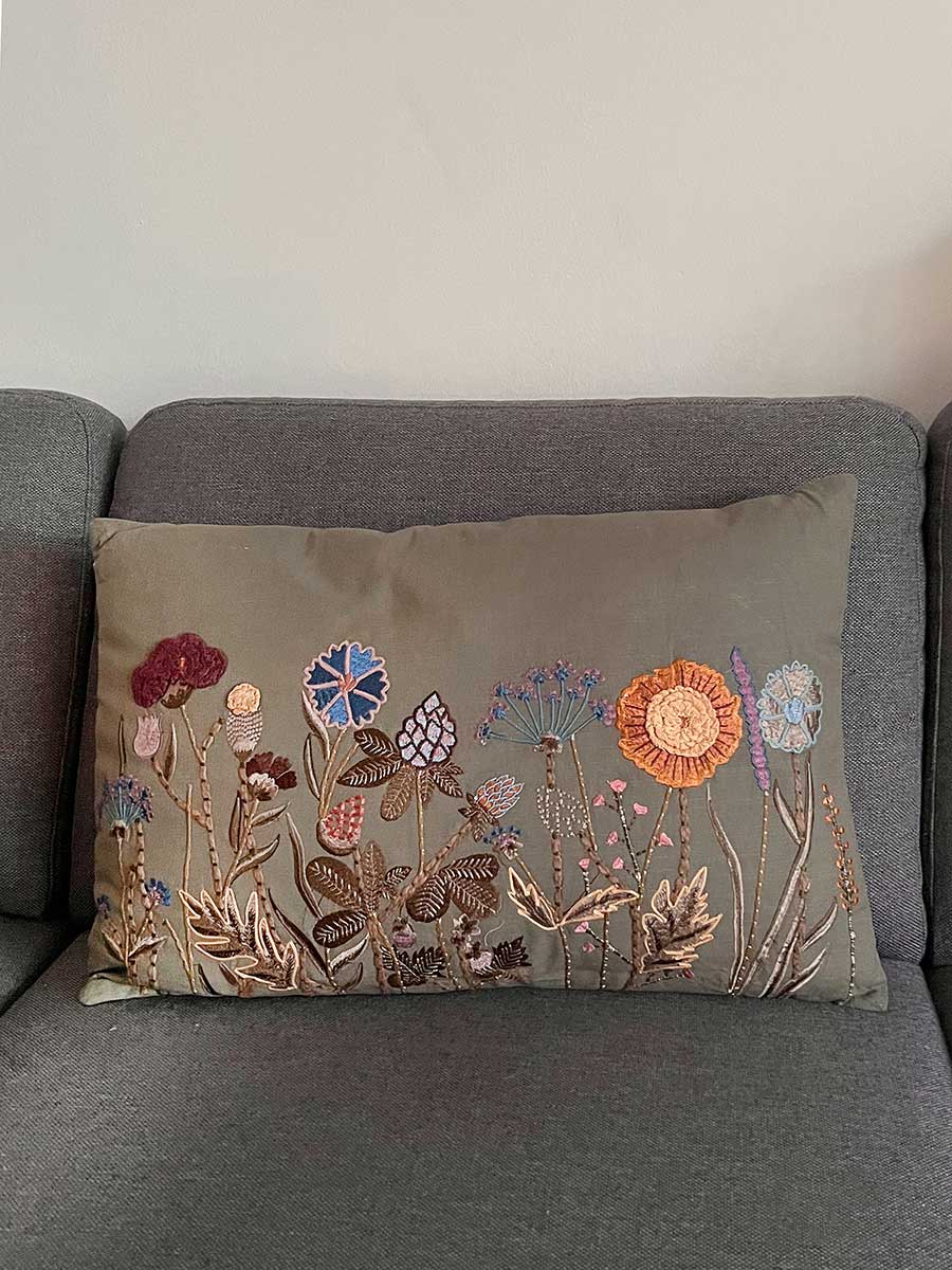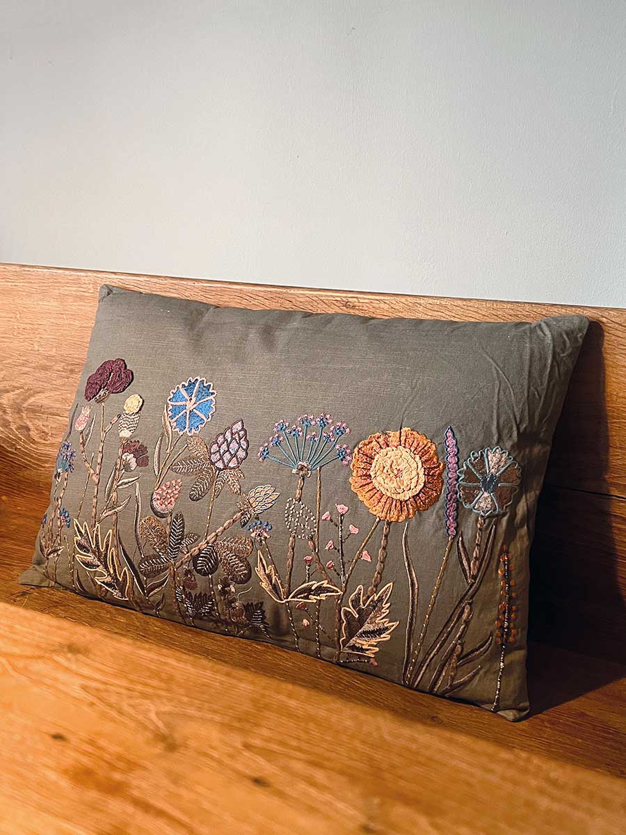 Hübsches Kissen mit aufwändiger Stickerei von der Firma bell arte. Ein außergewöhnliches Kissen mit festem Webstoff und verdecktem Reißverschluss auf der Rückseite. Das Kissen ist ein toller Hingucker auf dem Sofa oder der gemütlichen Gartenlounge. Die Kissenhülle besteht zu 100% aus Baumwolle, inklusive Füllung.