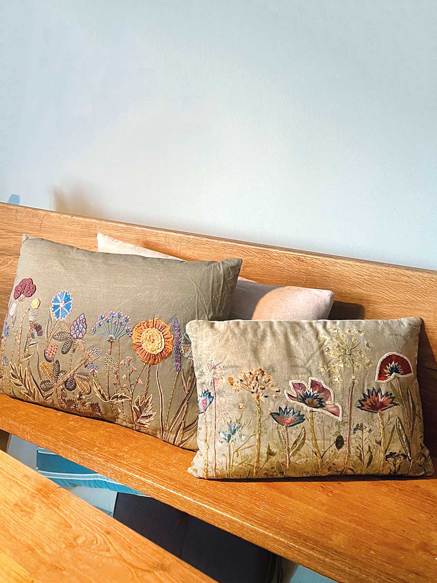 Hübsches Kissen mit aufwändiger Stickerei von der Firma bell arte. Ein außergewöhnliches Kissen mit festem Webstoff und verdecktem Reißverschluss auf der Rückseite. Das Kissen ist ein toller Hingucker auf dem Sofa oder der gemütlichen Gartenlounge. Die Kissenhülle besteht zu 100% aus Baumwolle, inklusive Füllung.